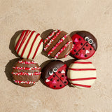 Love Bug Belgian Chocolate Covered Sandwich Cookies 6 PC- Sandwich Cookies (Unbleached Enriched Flour (Wheat Flour, Niacin, Reduced Iron, Thiamine Mononitrate Vitamin B1, Riboflavin Vitamin B2, Folic Acid), Sugar, Palm Oil And/Or Canola Oil, Cocoa (Processed With Alkali), High Fructose Corn Syrup, Leavening (Baking Soda And/Or Calcium Phosphate), Salt, Soy Lecithin (Emulsifier), Chocolate, Artificial Flavor), White Chocolate (Sugar, Cocoa Butter, Whole Milk Powder, Soy Lecithin (An Emulsifier), Natural Vanilla Flavouring), Milk Chocolate (Sugar, Cocoa Butter, Whole Milk Powder, Cocoa Mass, Soy Lecithin (An Emulsifier), Natural Vanilla Flavouring), Dark Chocolate (Cocoa Mass, Sugar, Cocoa Butter, Soy Lecithin (An Emulsifier), Natural Vanilla), Eye Icing (Sugar, Egg Albumen, Xanthan Gum, Fd&C Certified Colors (May Contain Fd&C Yellow 5 Or 6, Red 3 Or 40, And/Or Blue 1)), White Nonpareils (Sugar, Corn Starch, Confectioner's Glaze, Carnauba Wax), Pink Nonpareils (Sugar, Corn Starch, Confectioner's Glaze, Red 3, Carnauba Wax), Red Nonpareils (Sugar, Corn Starch, Confectioner's Glaze, Red 3, Red 40, Carnauba Wax, Yellow 6, Blue 2), Hearts Sprinkle Mix (Sugar, Rice Flour, Vegetable Oil (Palm, Palm Kernel), Corn Starch, Gum Arabic, Cellulose Gum, Confectioner's Glaze, Carrageenan, Titanium Dioxide (Color), Red 40, Yellow 6, Soy Lecithin, Red 3, Artificial Flavor)), Red Oil Candy (Soy Lecithin (An Emulsifier), Propylene Glycol, Red 3, Red 40, Yellow 5, Yellow 6)