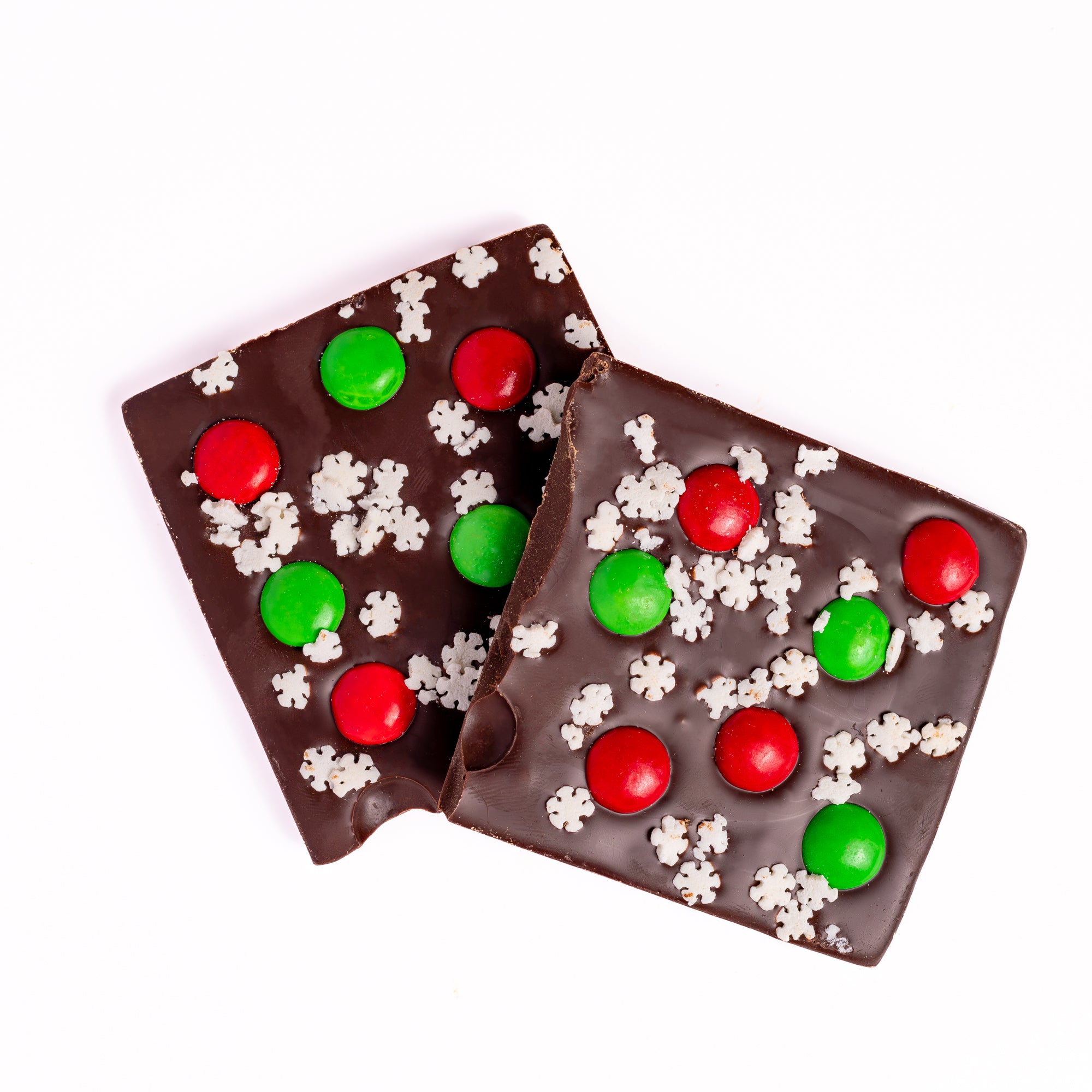 Ingredients: Dark Chocolate (Cocoa Mass, Sugar, Cocoa Butter, Soy Lecithin (An Emulsifier), Natural Vanilla), Snowflake Sprinkles (Sugar, Rice Flour, Vegetable Oil (Palm, Palm Kernel), Corn Starch, Gum Arabic, Cellulose Gum, Titanium Dioxide (Color), Confectioner's Glaze, Carrageenan, Soy Lecithin, Artificial Flavor), Dark Green Milk Chocolate Gems (Milk Chocolate (Sugar, Cocoa Butter, Chocolate Liquor, Whole Milk Powder, Soy Lecithin (An Emulsifier), Salt, Vanilla), Sugar, Less Than 1% Of Artificial Coloring (Includes Yellow 5 Lake, Yellow 5, Blue 1, Blue 1 Lake), Gum Acacia, Corn Syrup, Carnauba Wax)), Red Milk Chocolate Gems (Milk Chocolate (Sugar, Cocoa Butter, Chocolate Liquor, Whole Milk Powder, Soy Lecithin (An Emulsifier), Salt, Vanilla), Sugar, Less Than 1% Of Artificial Coloring (Includes Red 40 Lake), Gum Acacia, Corn Syrup, Carnauba Wax))